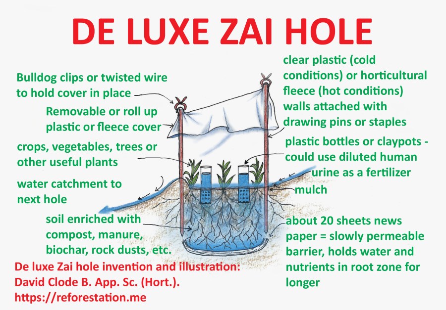De luxe Zai hole diagram. Zai holes can increase the growth of grains, vegetables and trees, especially in compacted infertile soils in drier climates or seasons. De luxe Zai hole invention and illustration by David Clode.