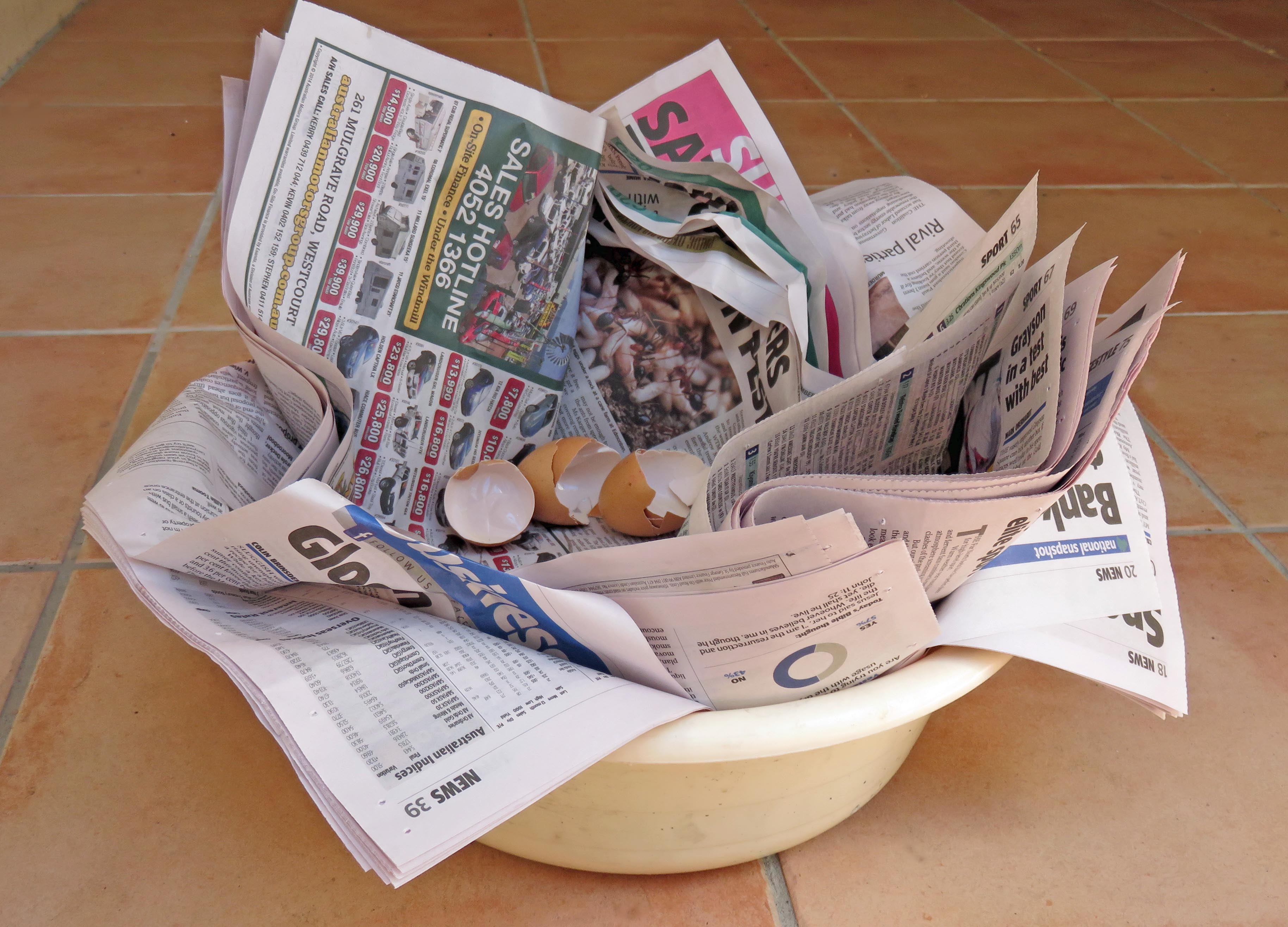 A plastic “washing up bowl” lined with 20 sheets of newspaper, for defecation. The whole lot can be placed at the bottom of a hole which has a concave base, and then plant trees or other plants. Household food waste could also be added, such as egg shells and vegetable scraps. With an arrangement like this, defecation could occur inside a home, instead of a separate outdoor toilet. The human manure would of course be covered with sawdust, soil, rice hulls or similar after each defecation.