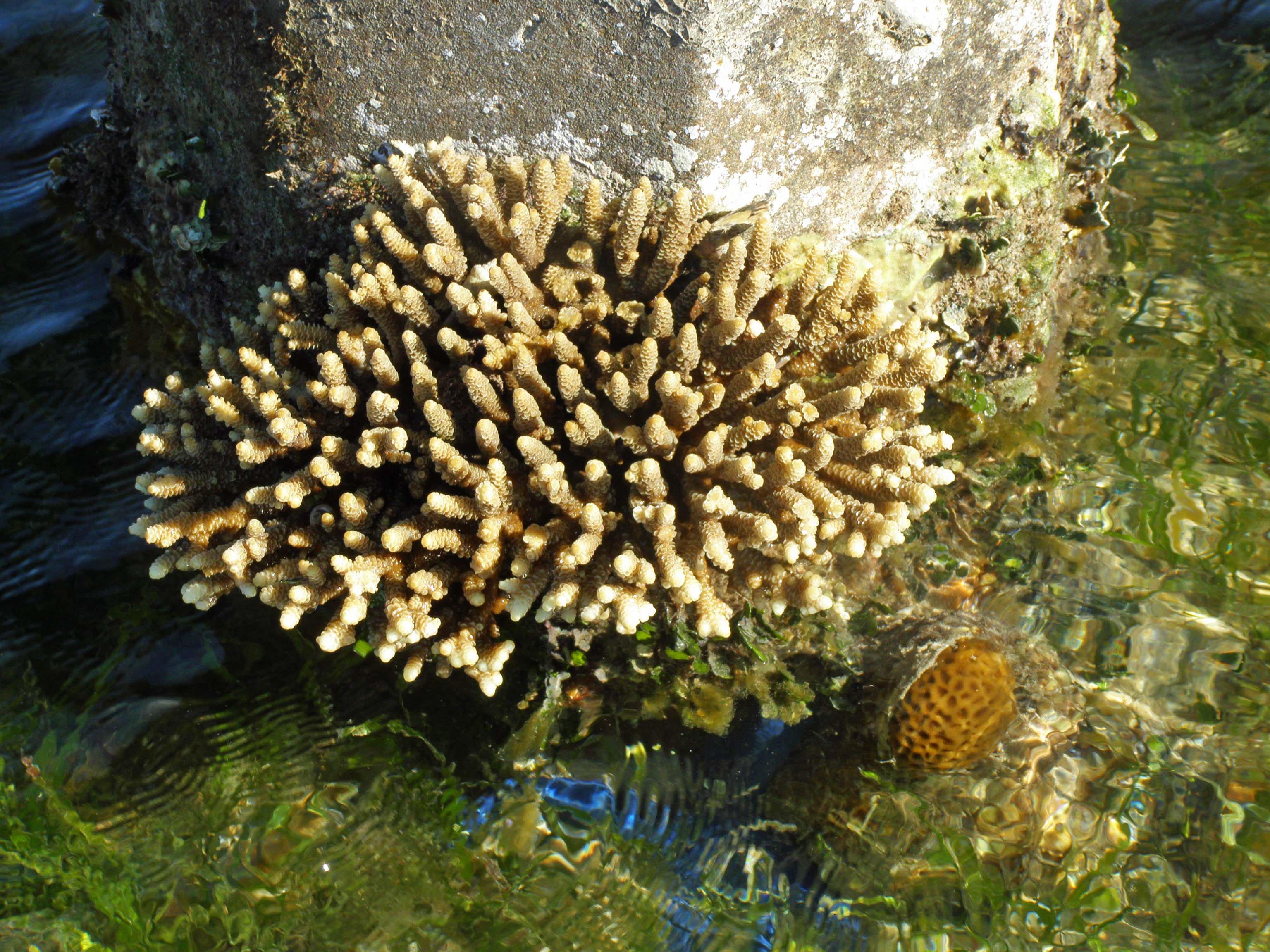 Naturally regenerating coral on a concrete pylon.