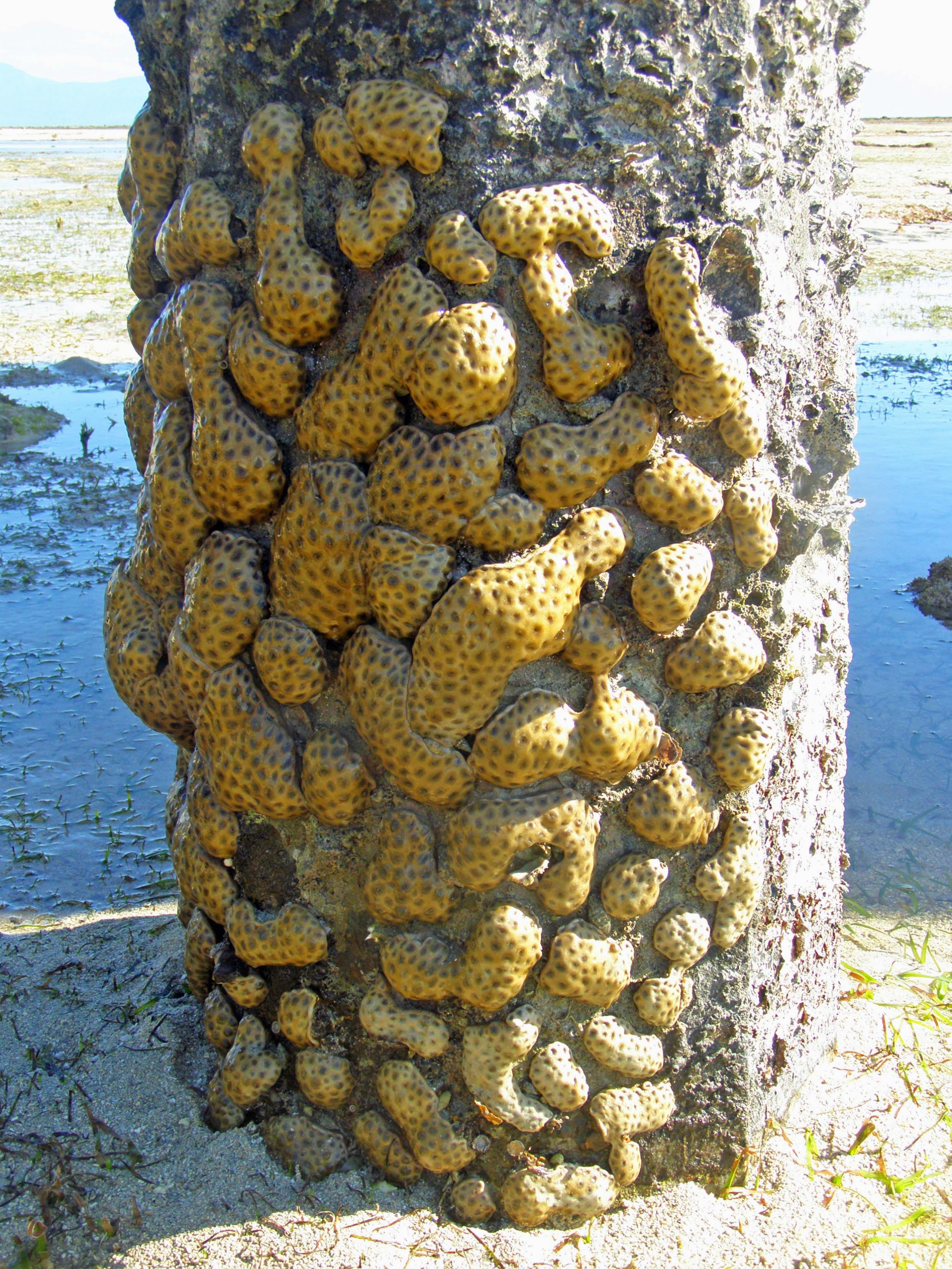 Soft coral growing on a concrete pylon, exposed during a very low tide.