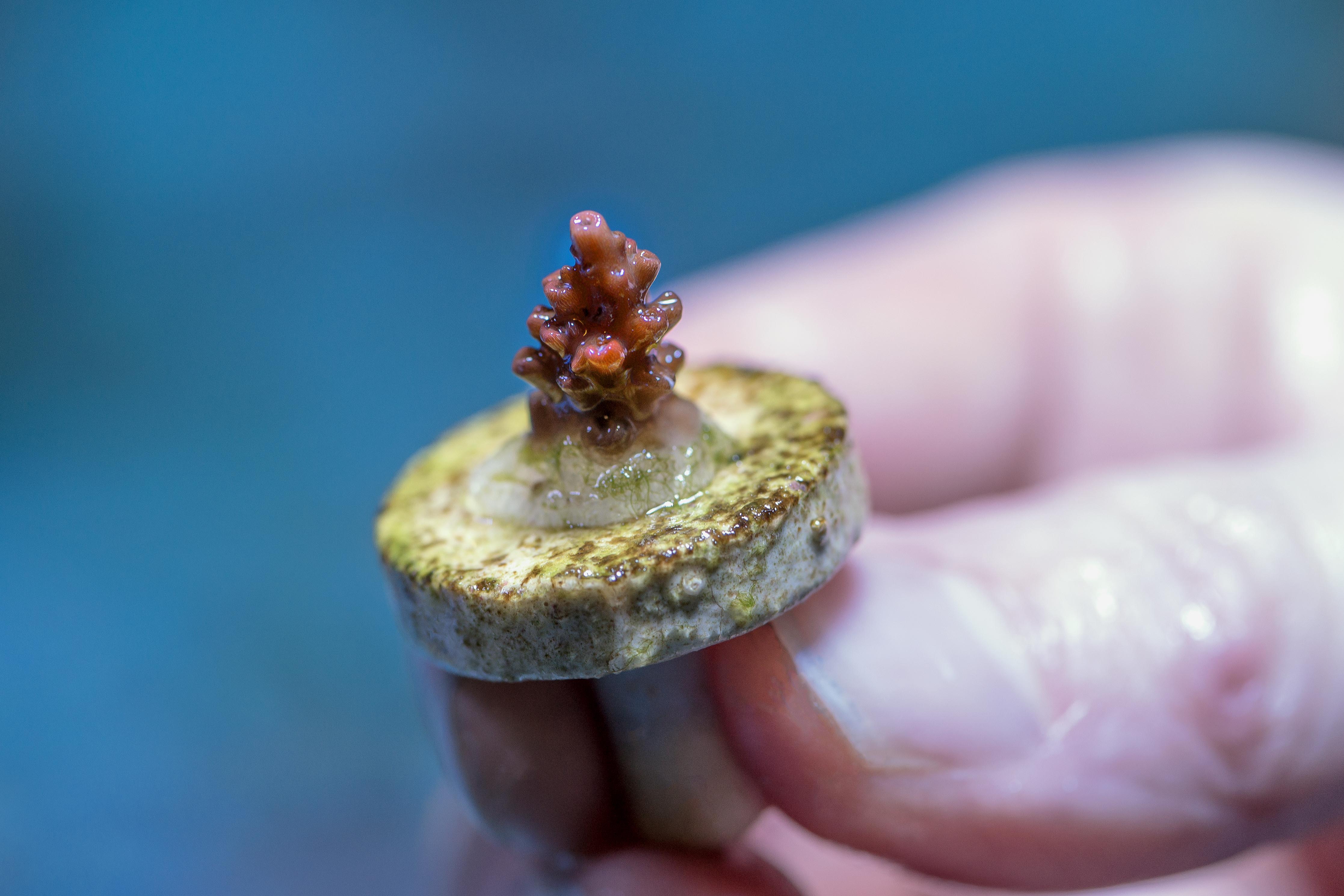 Coral frag (fragment) grown at the Cairns Aquarium in Australia. When it gets bigger, it may be used to help restore a damaged reef on the Great Barrier Reef, or in one of the tanks at the Cairns Aquarium. Thanks to Izaac Lilley, senior aquarist, for enabling access to take this photo.