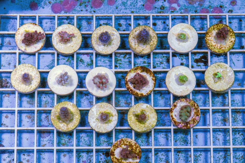 Coral frags (fragments) growing at the Cairns Aquarium, similar to growing cuttings from plants. Thanks to Izaac Lilley, senior aquarist, for showing me around behind the scenes. Photo: David Clode.