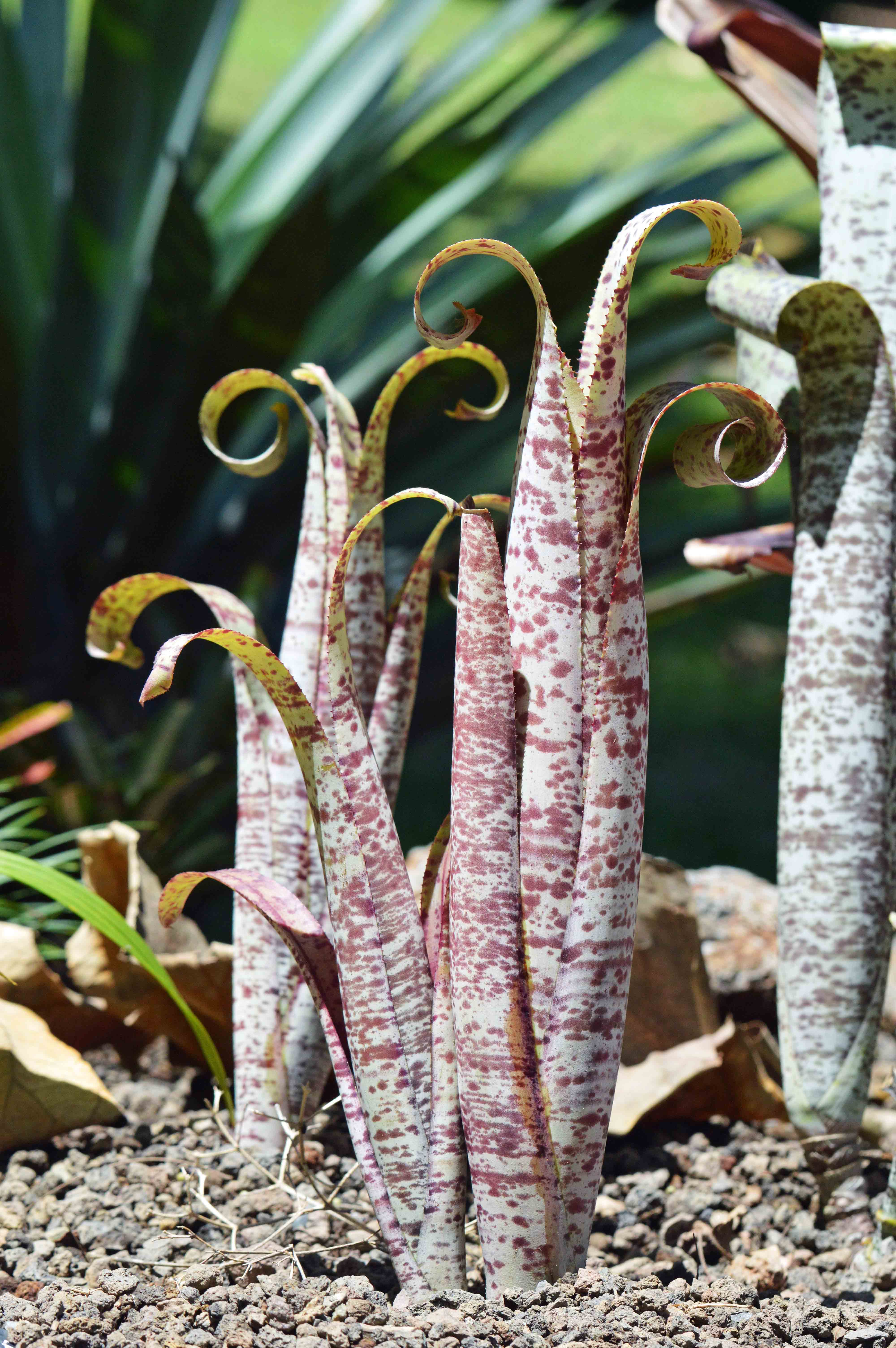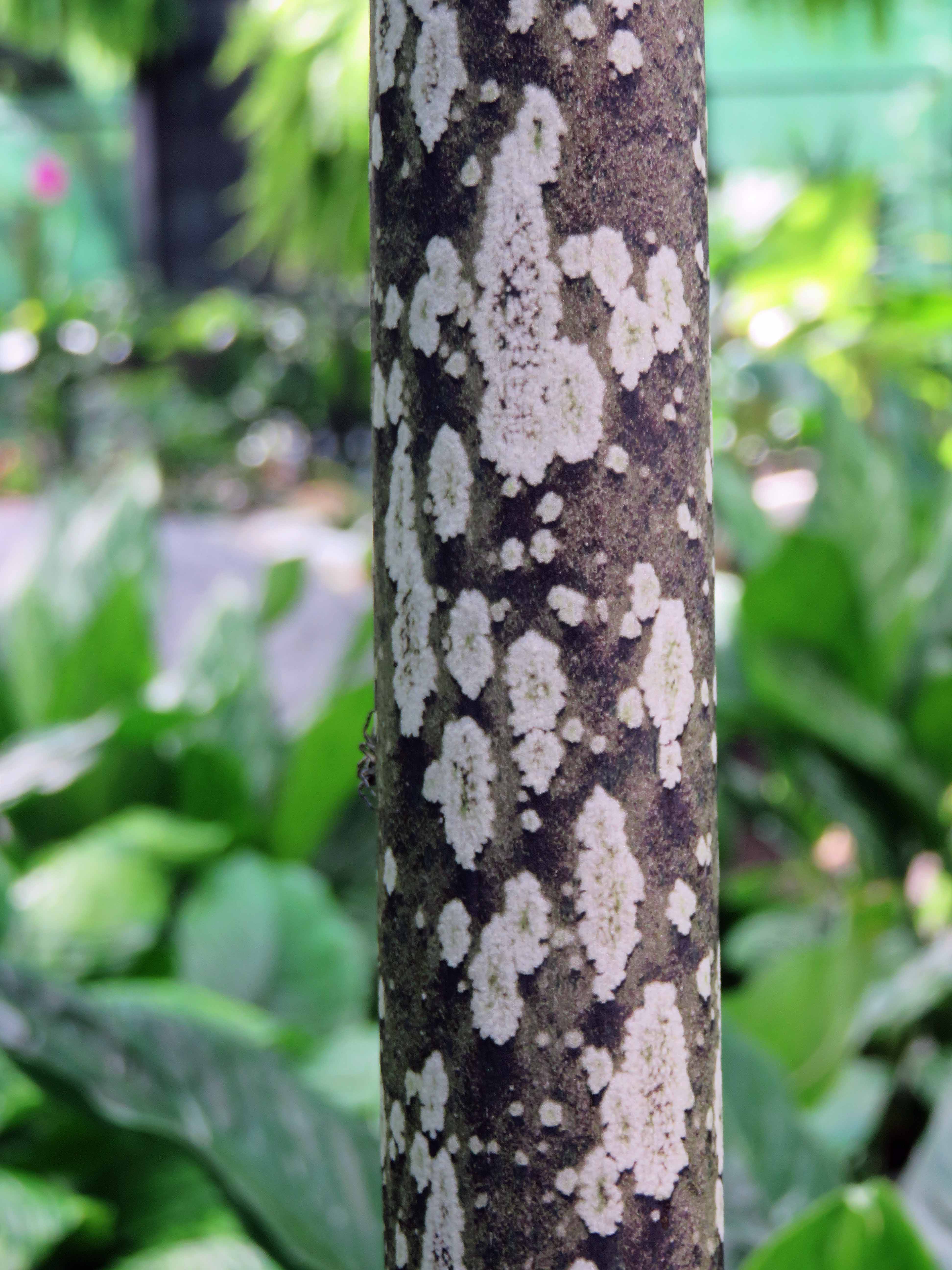 Leaf stem of Amorphophallus variabilis x A. decus-silvae. This is a young leaf stem, smooth and about 5cm in diameter. In the rain forest, there are many insects and animals looking for soft young growth to eat, and this camouflage mimics an old, lichen-covered tree stem, which may protect it from being eaten. photo: David Clode.