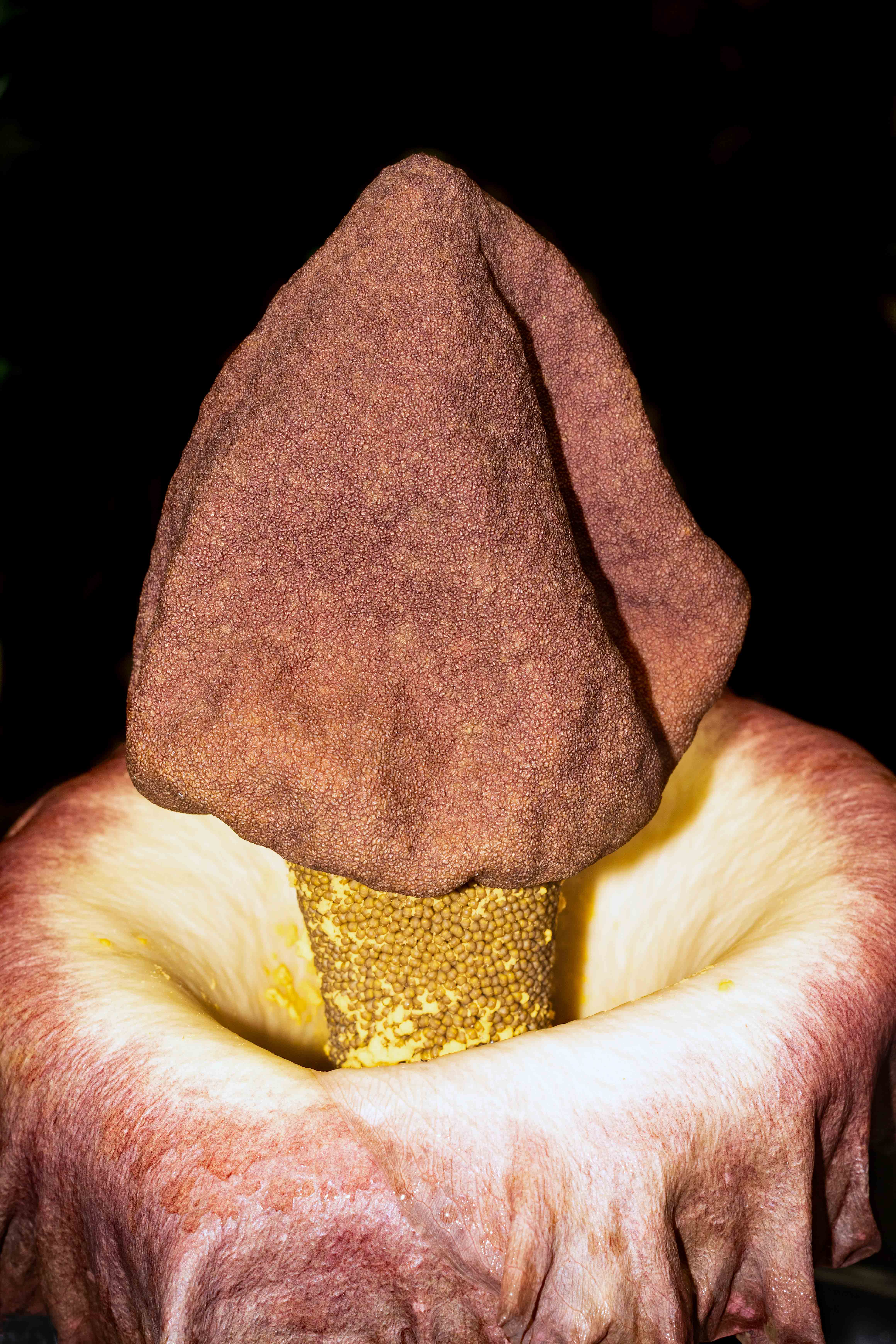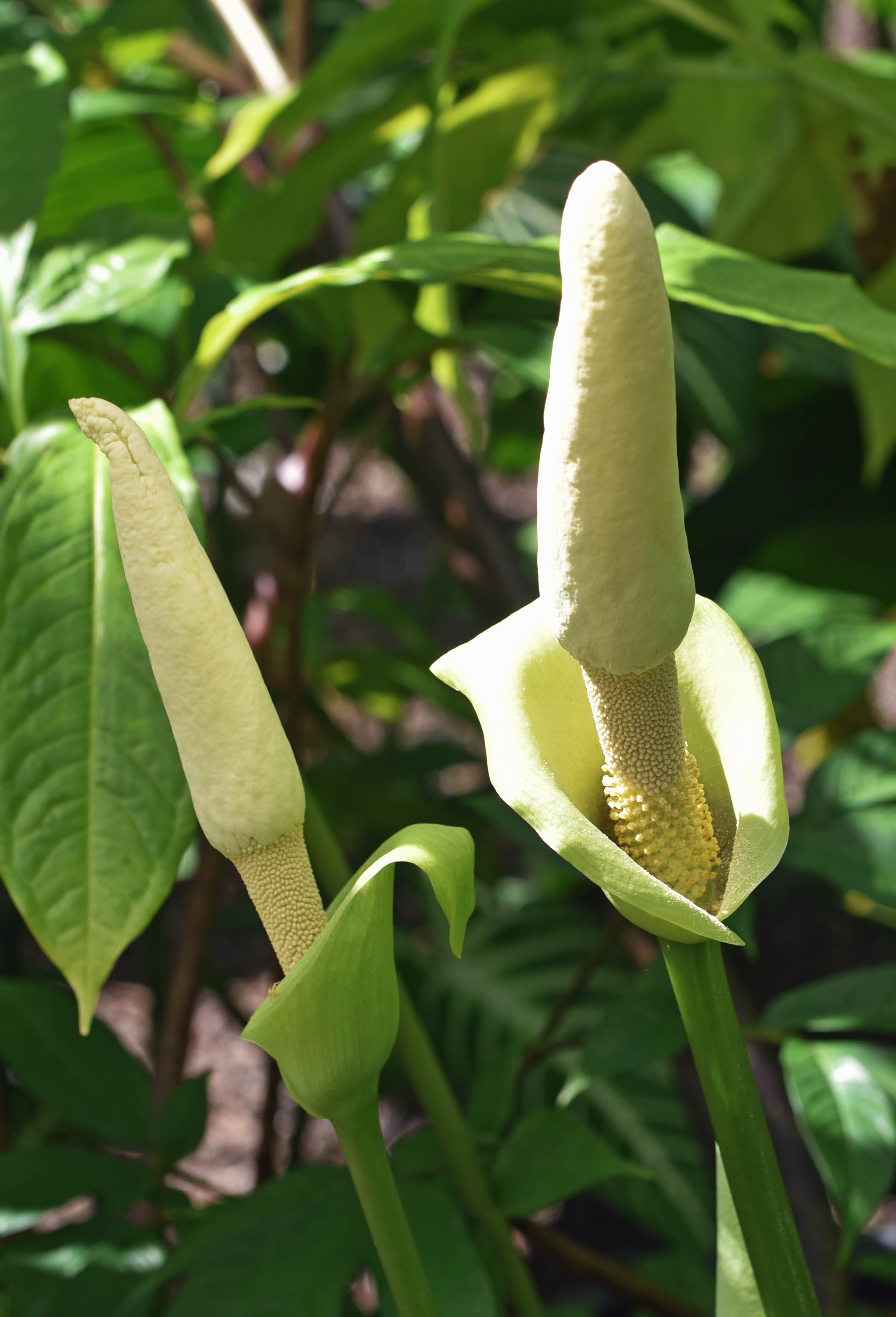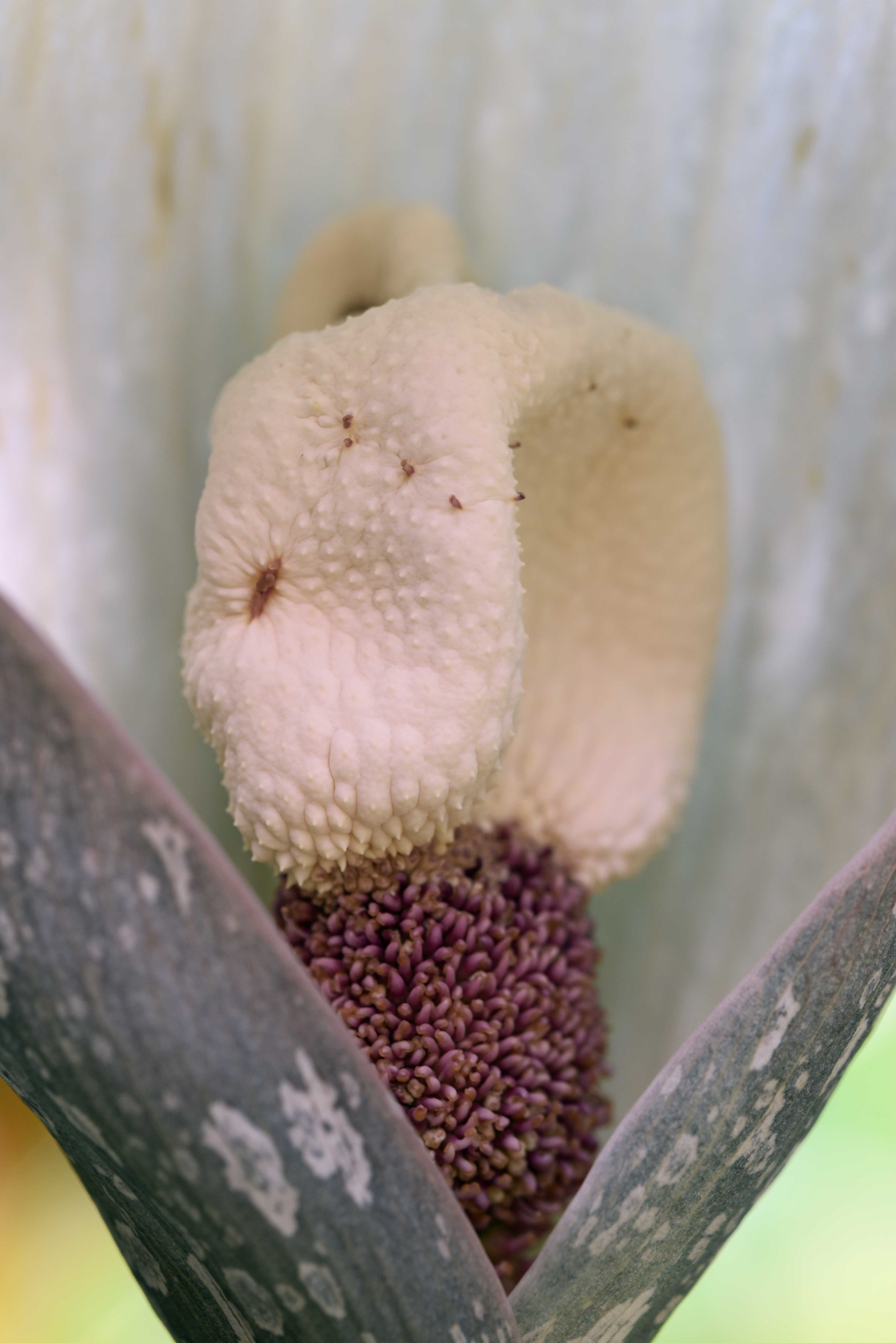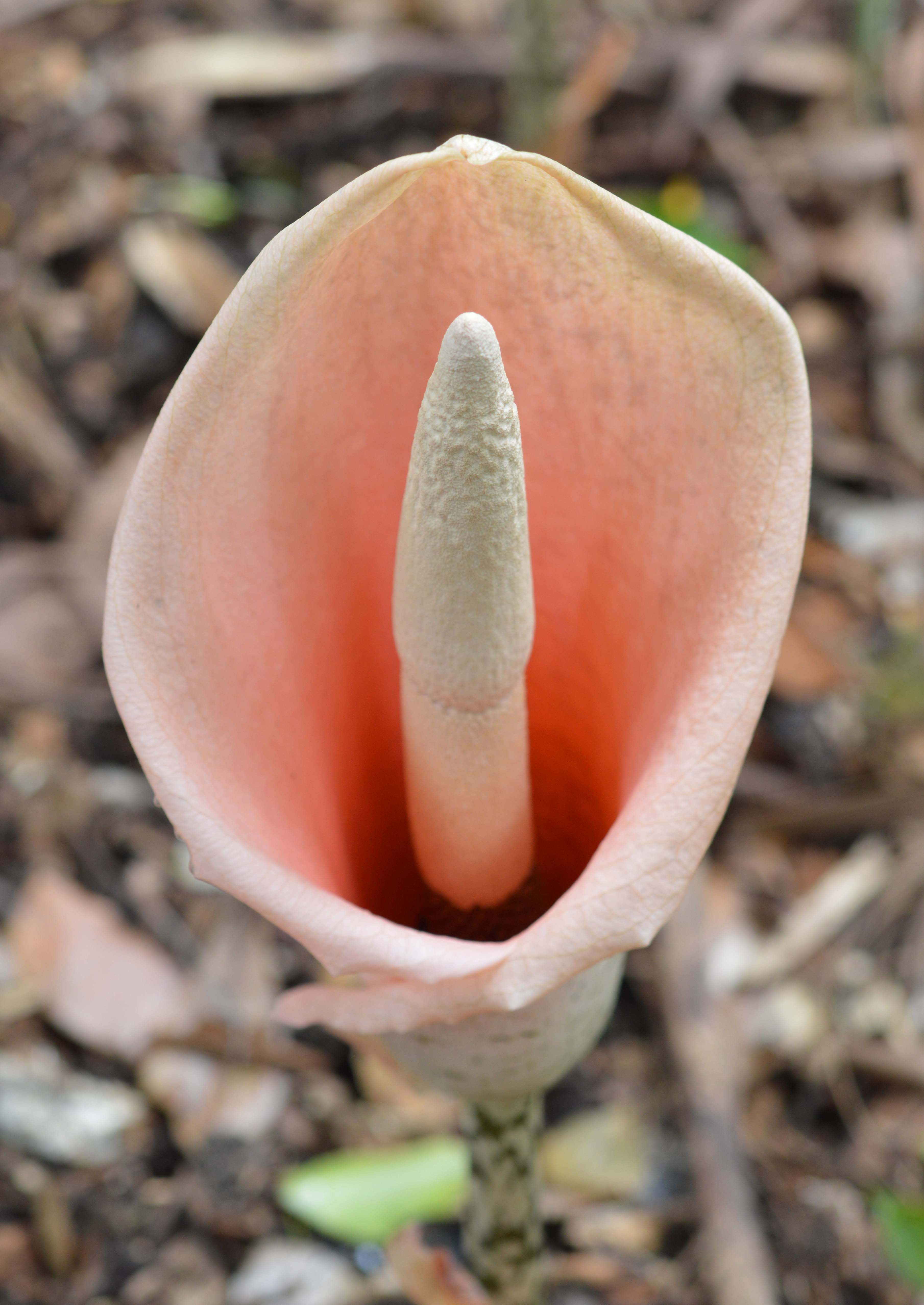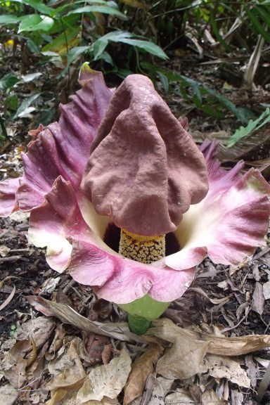 Dracontium gigas. Flowers periodically give off an unpleasant odour, which attracts pollenators such as flies and carrion beetles. Cairns Botanic gardens. Photo: David Clode.