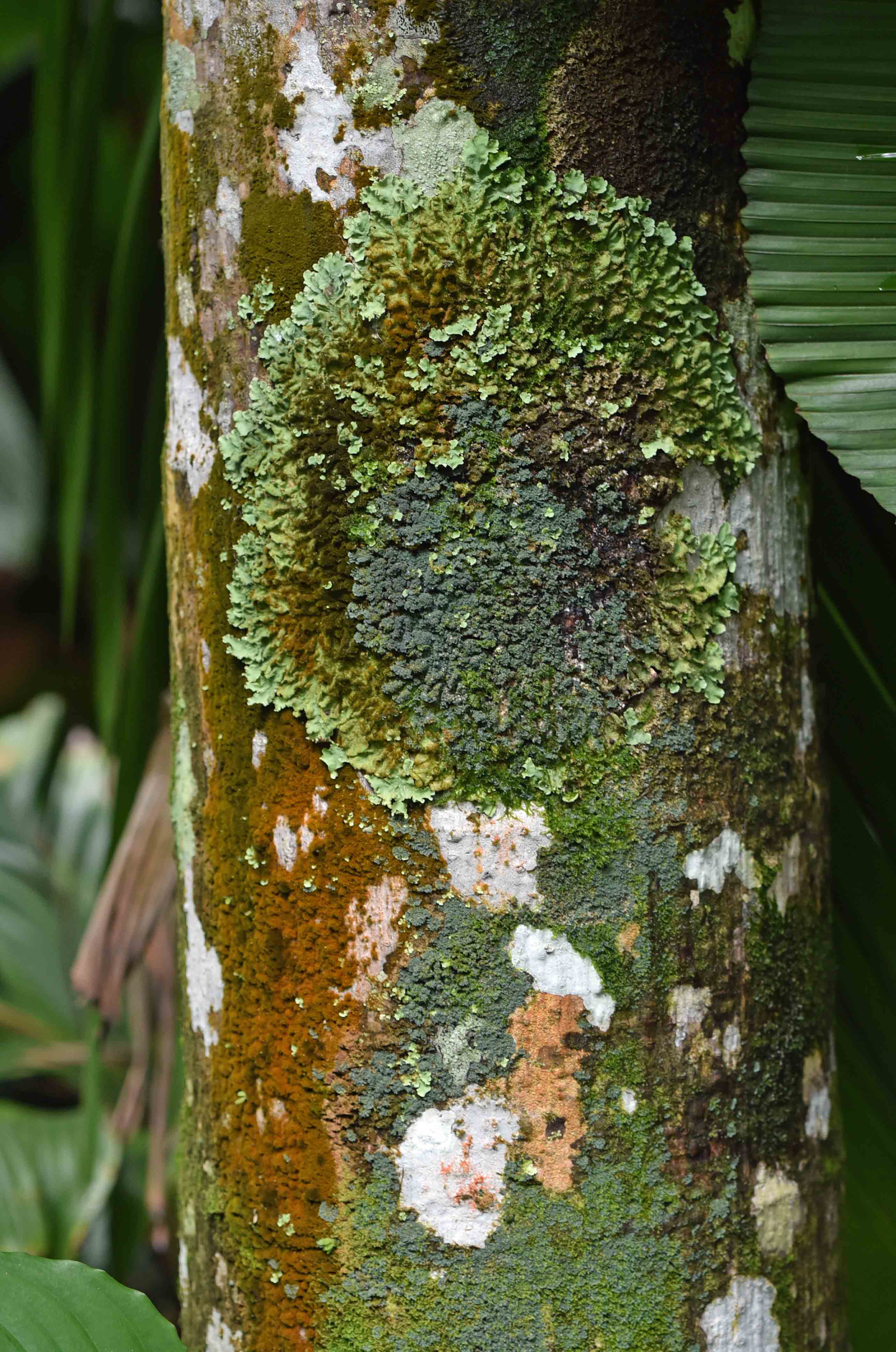 Mosses and lichens on a palm tree.