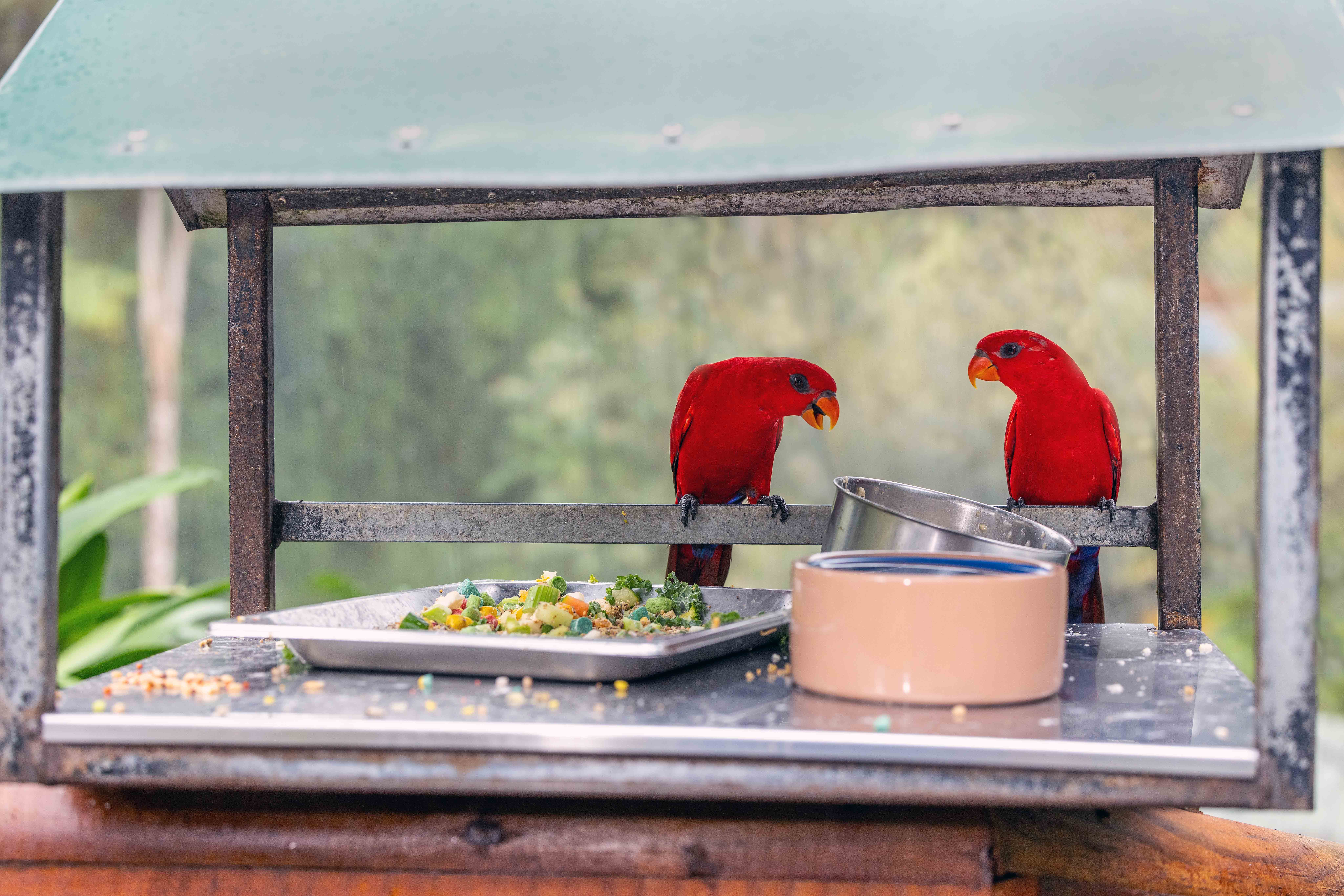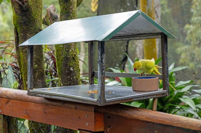 Note the roof to stop the food getting wet, and the smooth surfaces including stainless steel and porcelain rather than wood, for hygiene purposes. A feeder can be made of wood, with a single large porcelain tile on the floor, or possibly a melamine board (but some birds may chew on this).