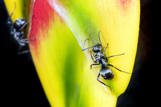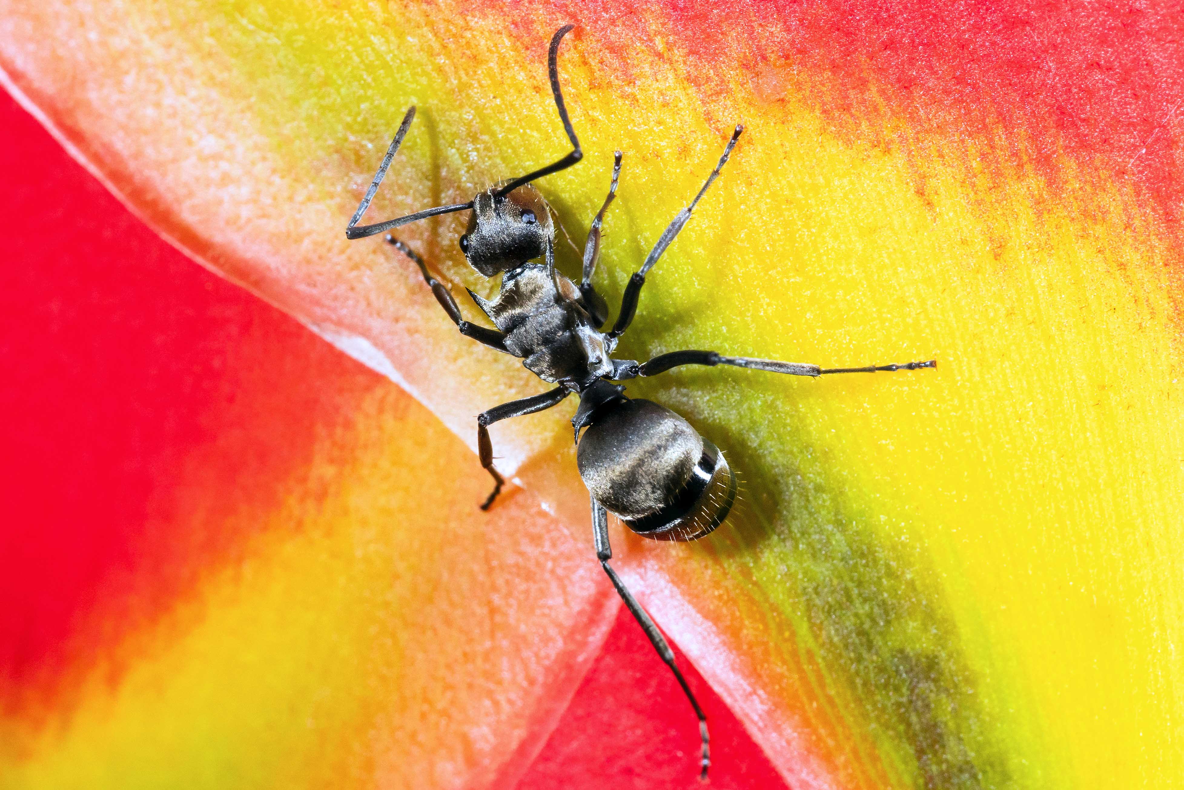 A rain forest ant on a heliconia flower at the Cairns Botanic gardens. Photo: David Clode.