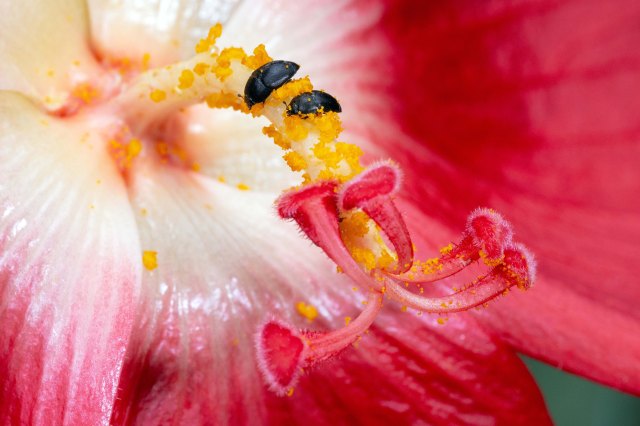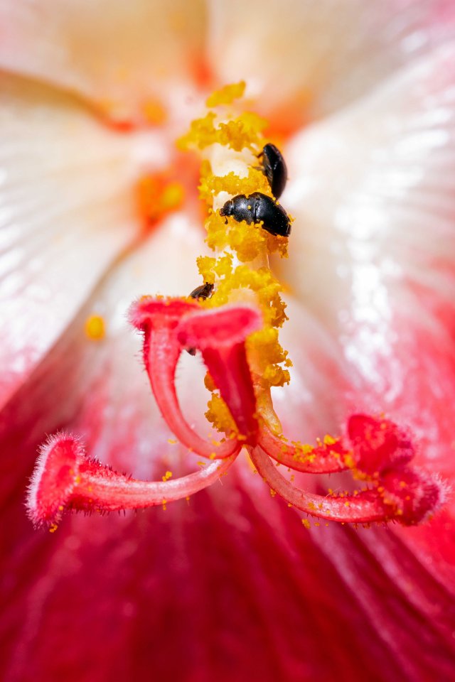 Small beetles in an Abelmoschus moschatus flower. Cairns Botanic gardens. David Clode.
