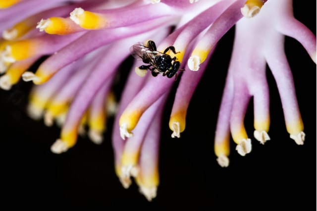 An Australian Native Bee (about half the size of a house fly} on a Cannon Ball Tree flower. Cairns Botanic gardens. David Clode.