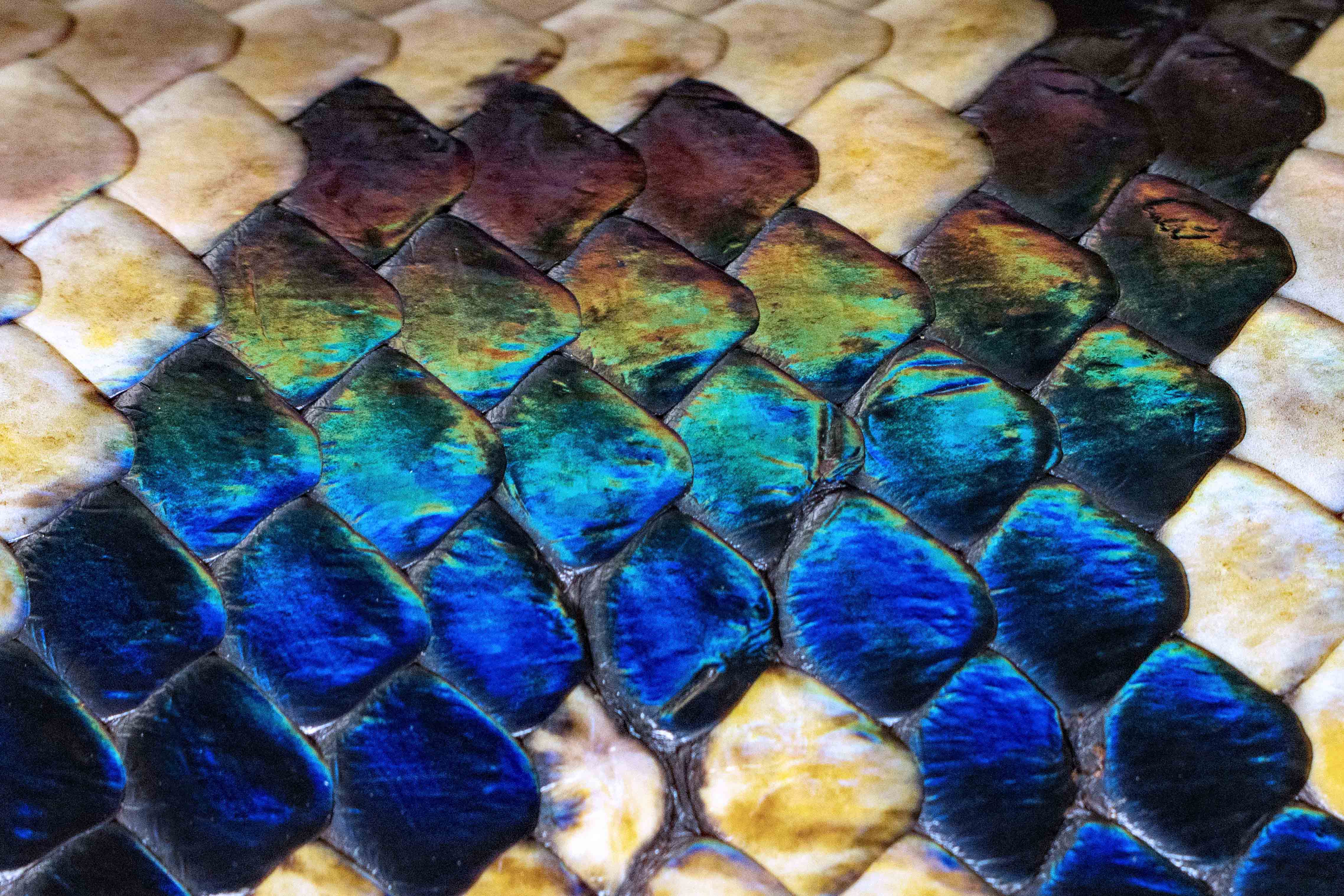 Iridescent scales of a Reticulated Python, the longest type of snake in the world. Hartleys Crocodile Adventures. Photo: David Clode.