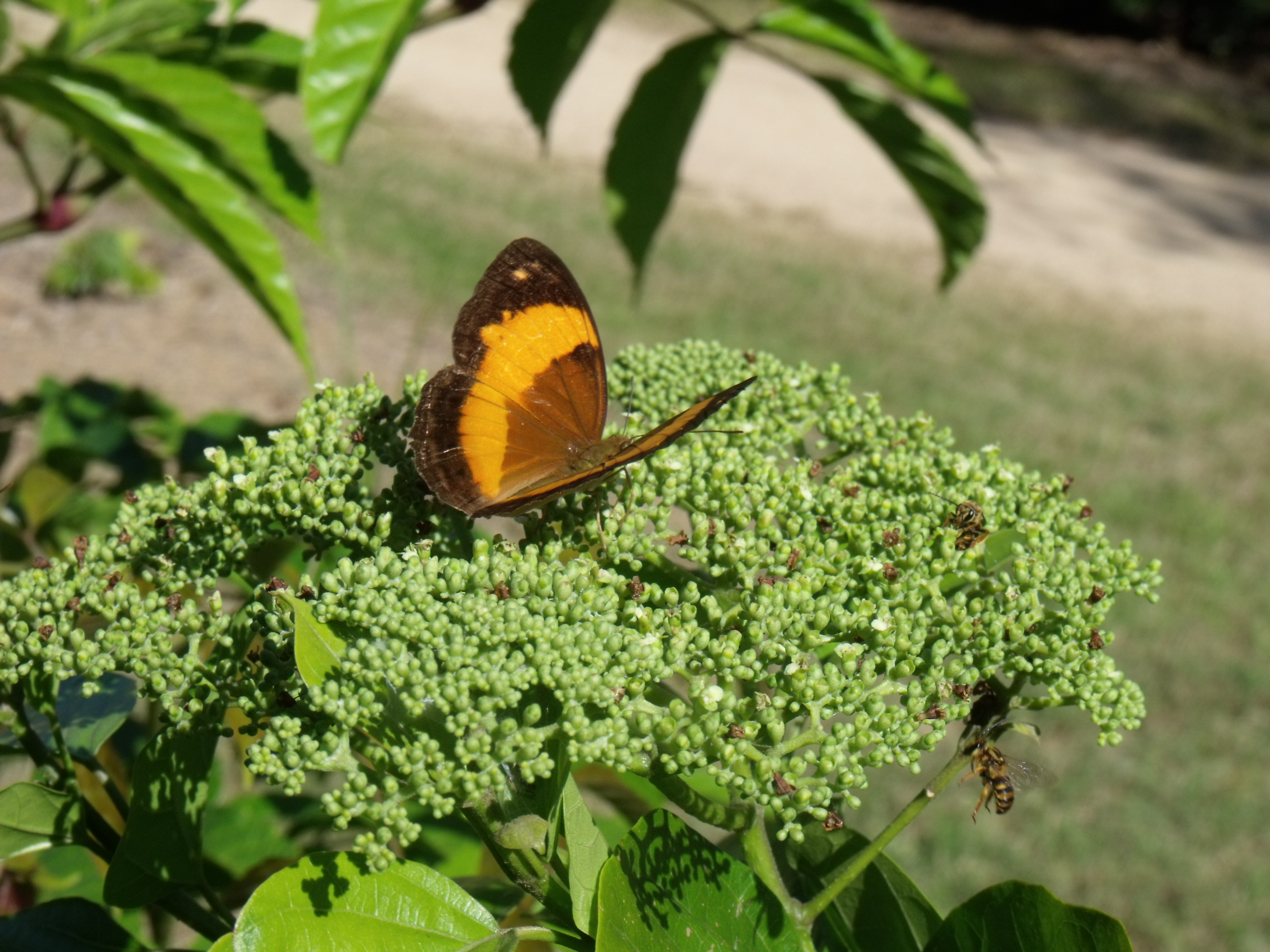 Australian Rustic butterfly Cupha prosope and two native bees visiting Premna serratifolia for nectar. Wild, Cattana wetlands. Photo: David Clode.