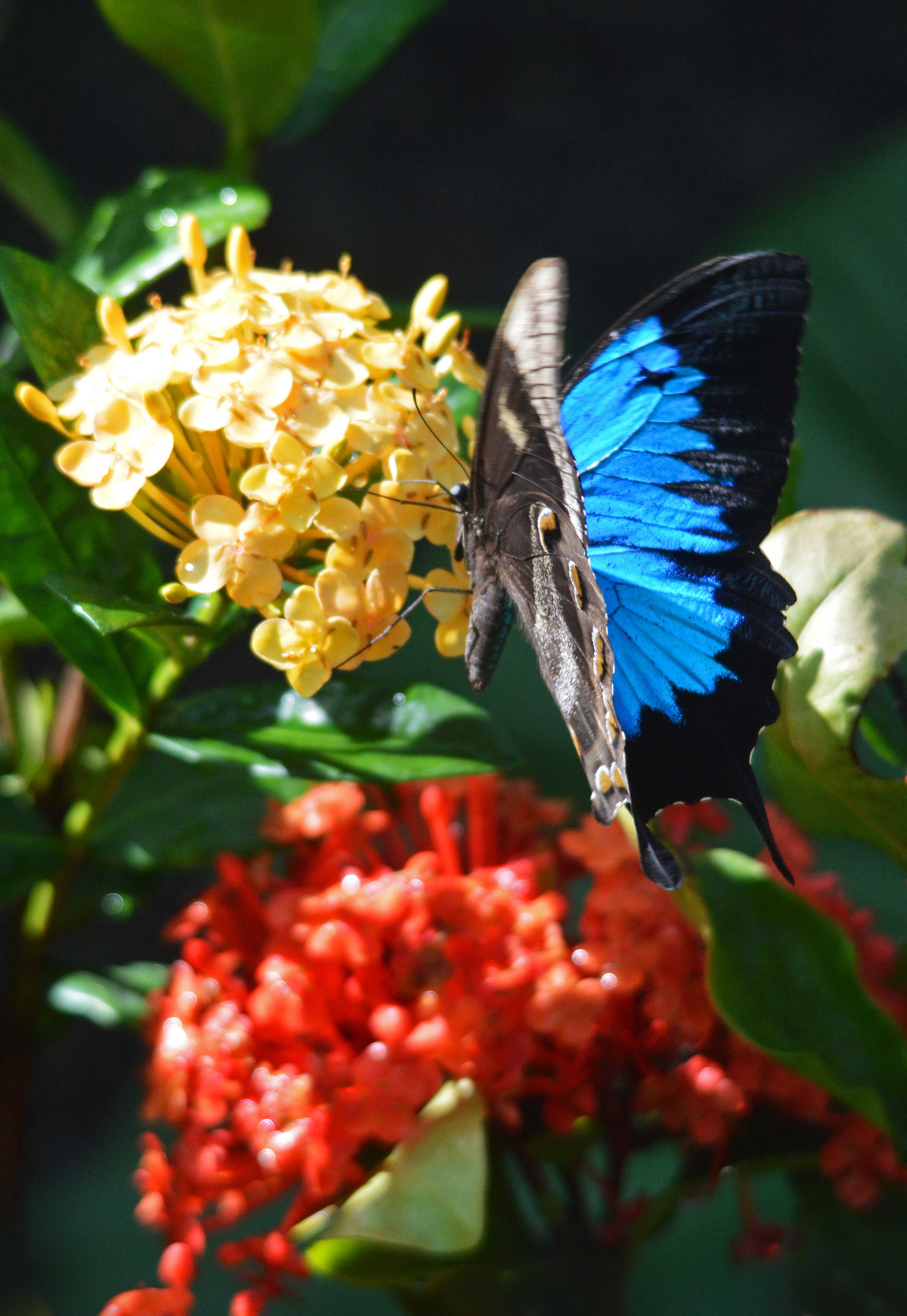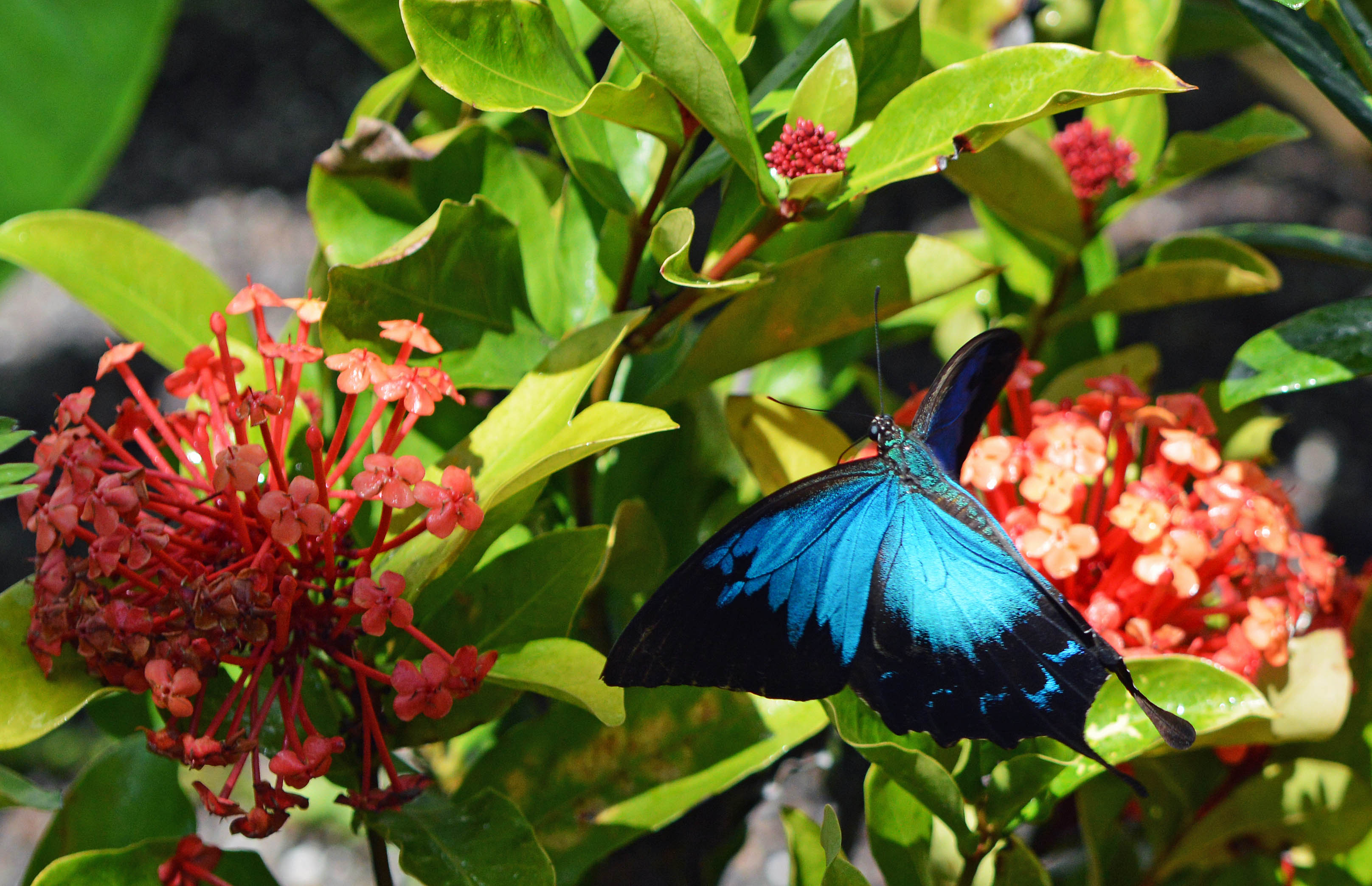 Ulysses Butterfly Papilio Ulysses on Ixora flowers. Conservatory. Photo: David Clode.