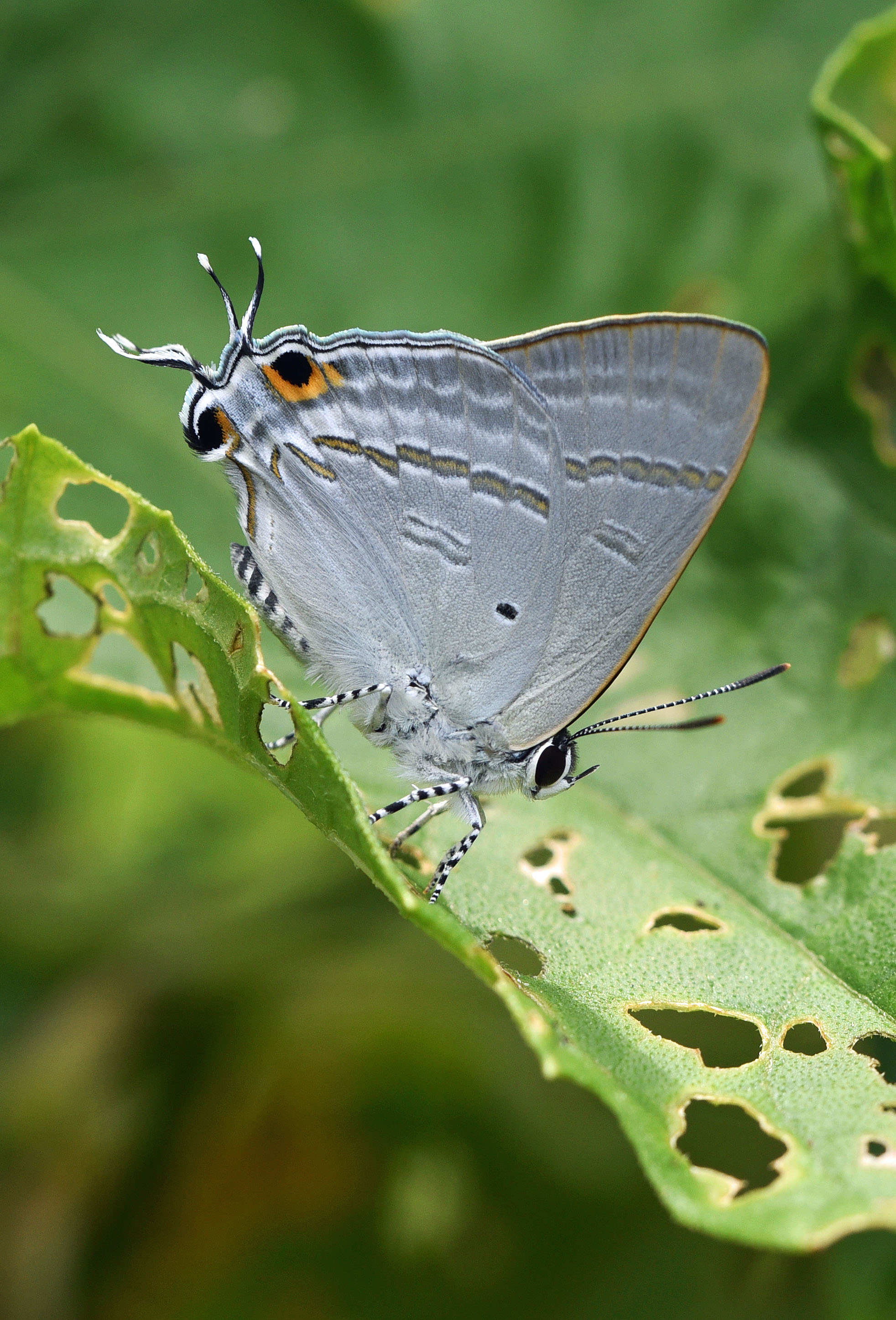 Common Tit Hypolycaena phorbas. Note the false “eyes”, as well as the tail appendages which the butterfly moves as a decoy to fool predators – unlike this photo, they are often not intact (the butterfly moves its wings, giving the appearance of moving antennae). Wild, Enmore Street, Cairns. Photo: David Clode.
