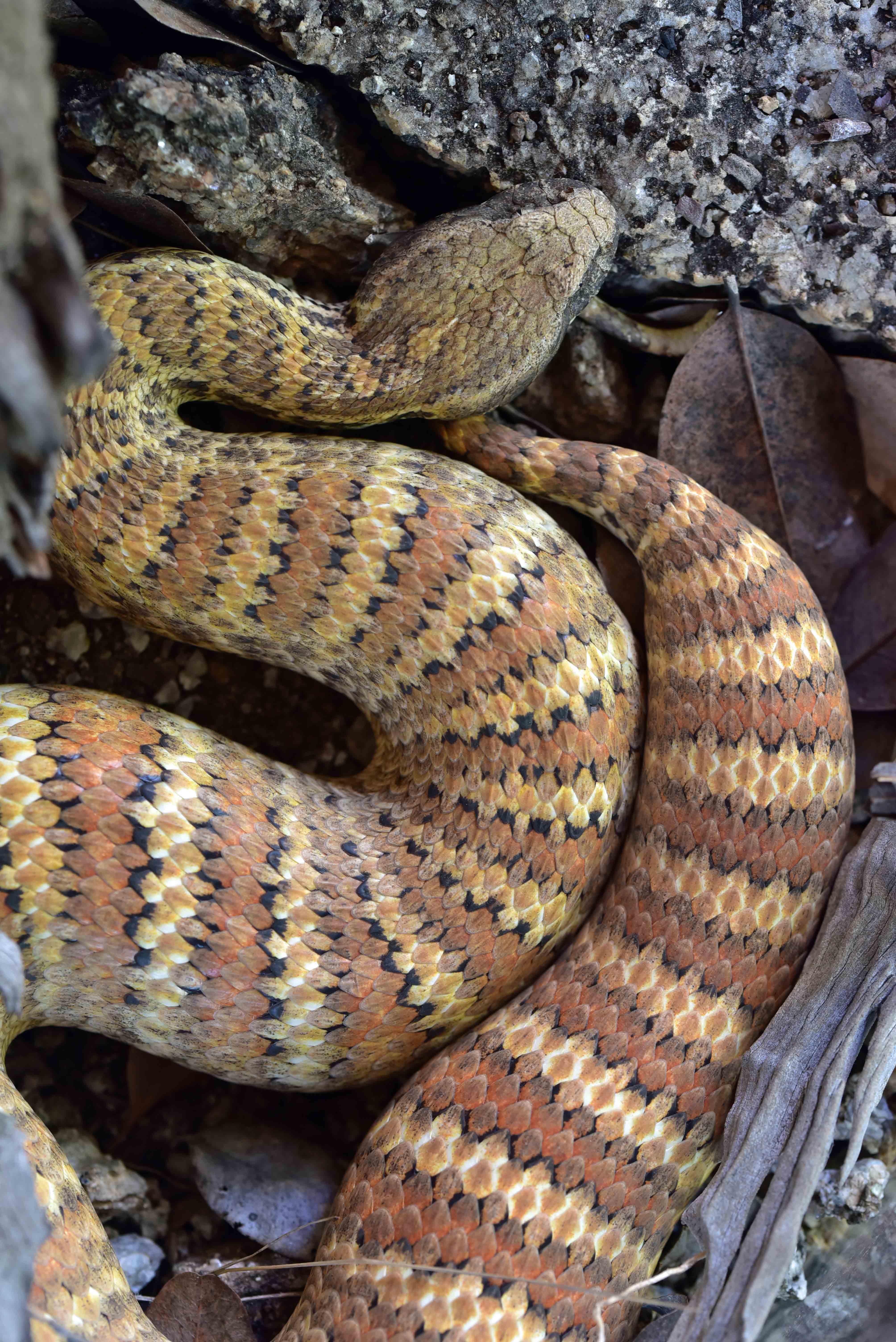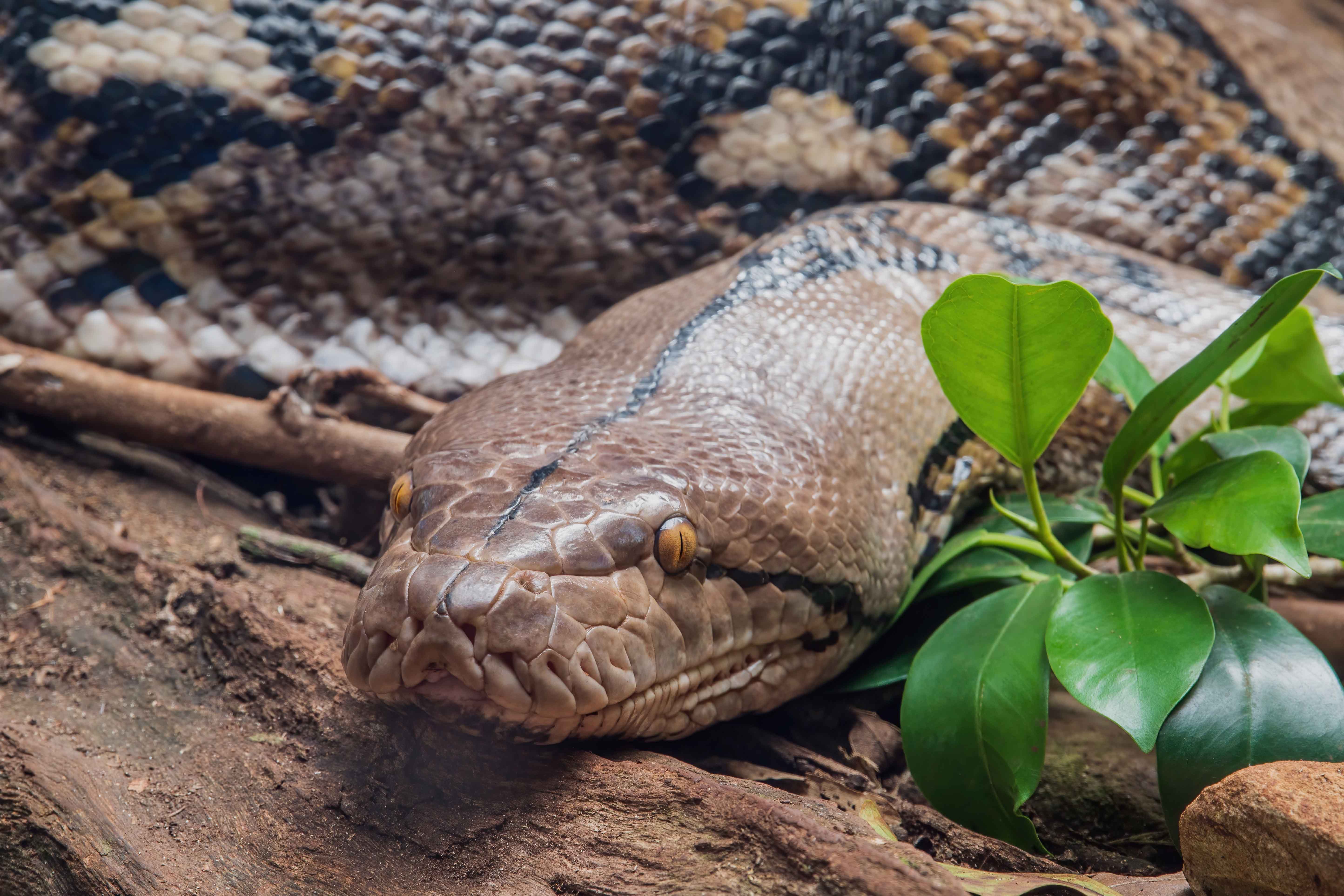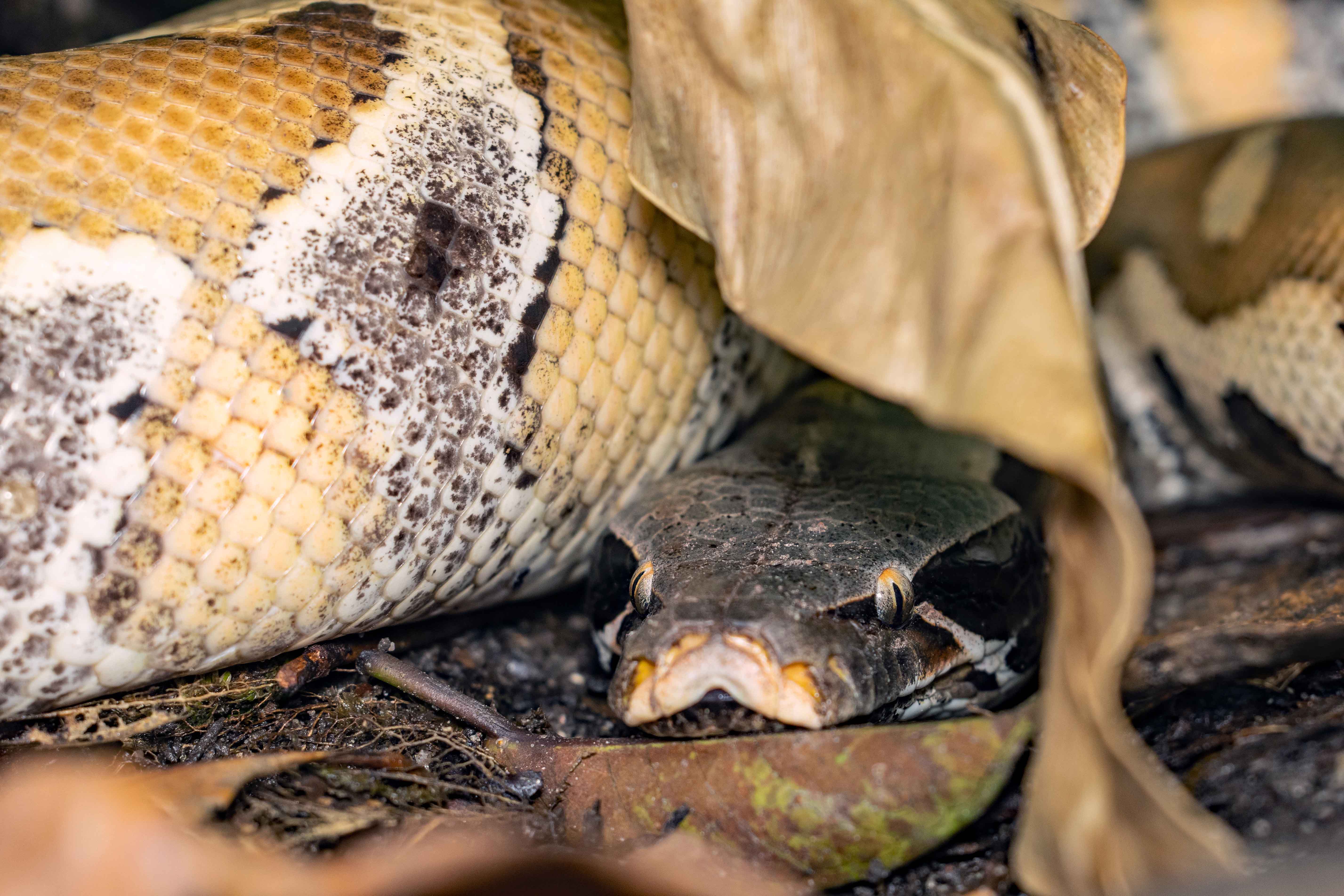 A Blood Python hiding under leaves. Hartleys Crocodile Adventures, Australia. Photo: David Clode.