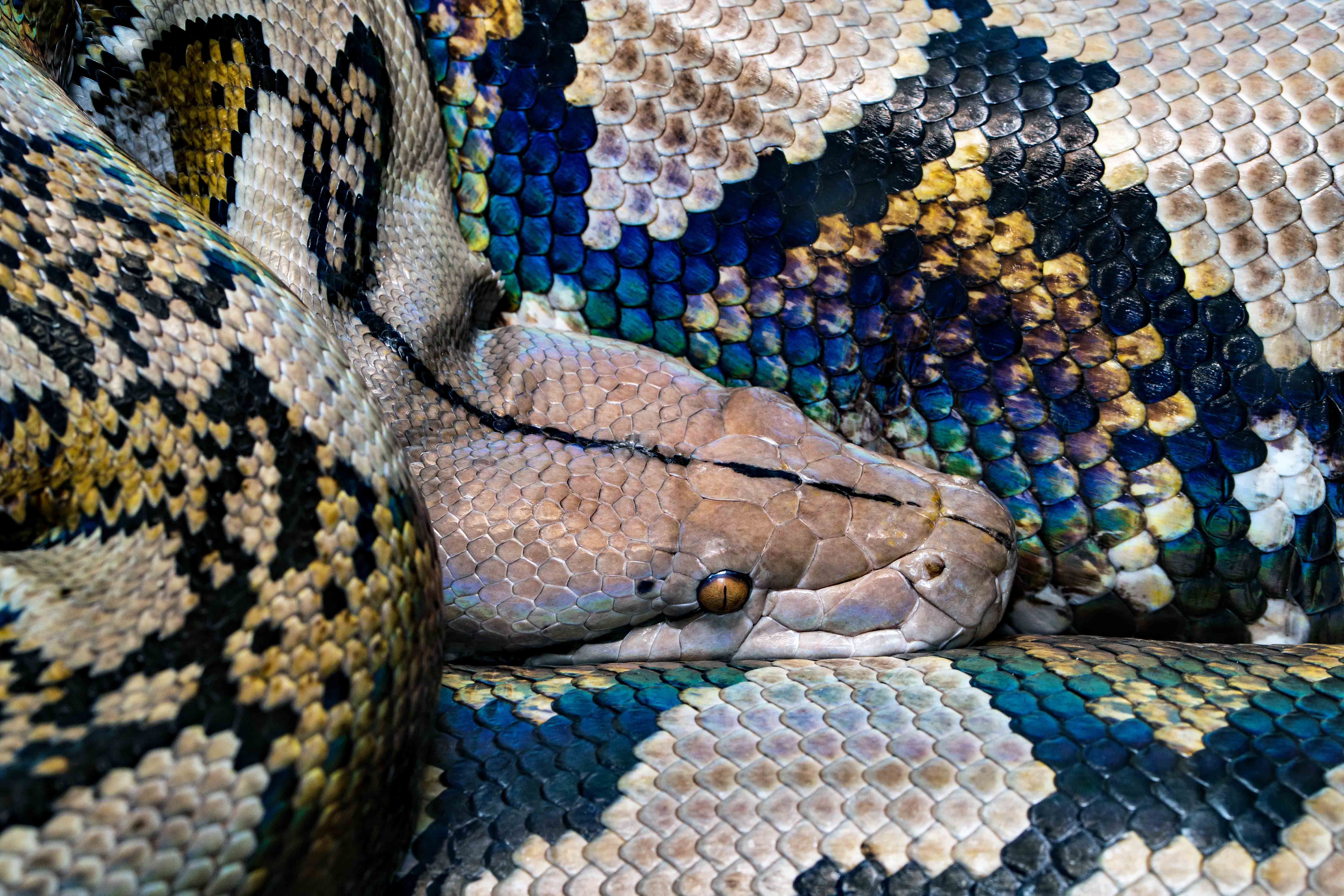 Close up of a Reticulated Python, the longest type of snake in the world. Photo: David Clode, at Hartleys Crocodile Adventures in Australia.