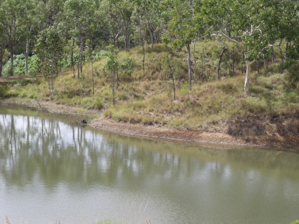 This farm dam with no vegetation on the water’s edge provides no habitat, places to breed or hide for wildlife. Farm dams are mainly about storing water, and some water would be lost from transpiring vegetation growing on the water’s edge. Atherton Tablelends, North Queensland.