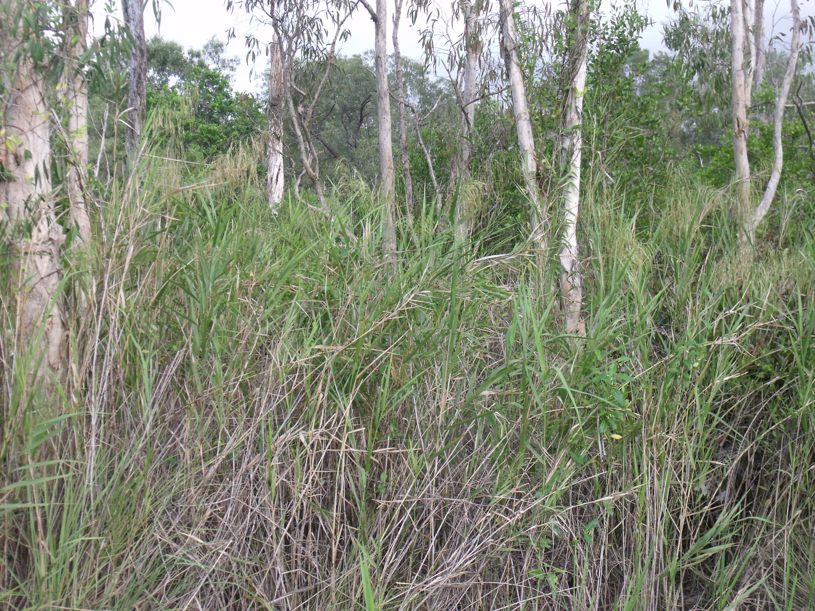 Phragmites australis reeds, found in many parts of the world, forming a thicket, growing with Melaleuca quinquenervia. Cairns, Australia.