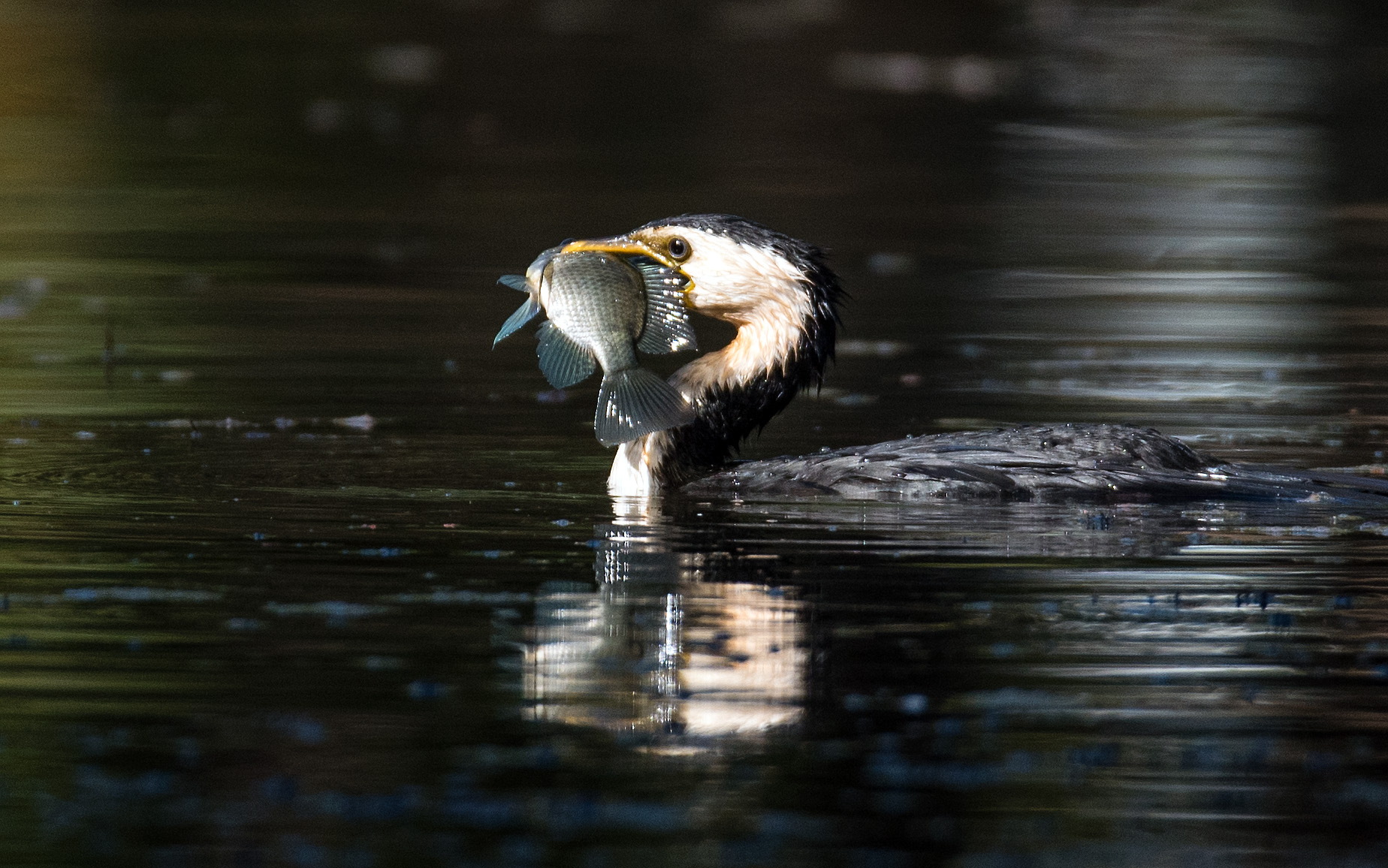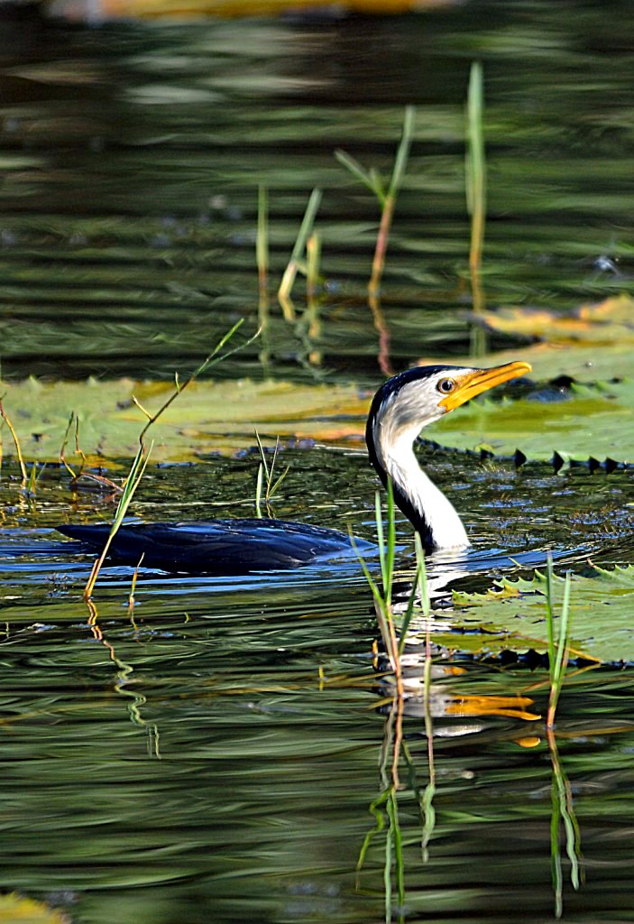 A Little Pied Cormorant fishing beneath water lily leaves.